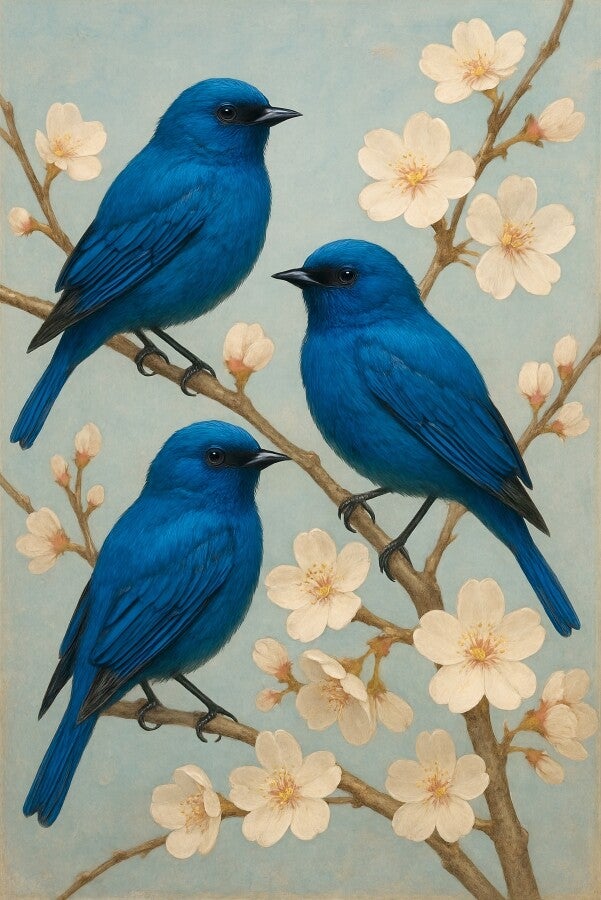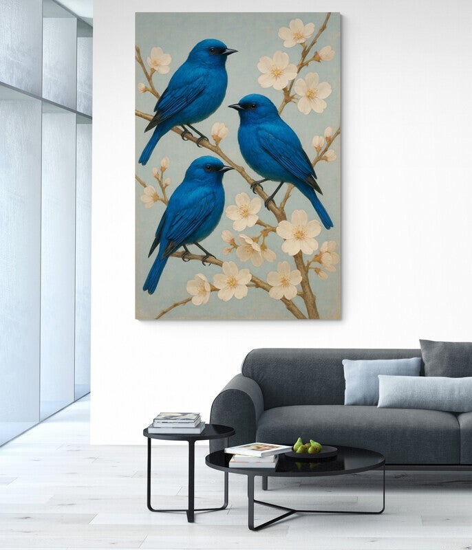 Een dromerig schilderij waarin drie felblauwe vogels plaatsnemen tussen tere bloesemtakken. De compositie ademt een klassieke schildersstijl, met zachte penseelachtige structuren en een subtiele balans tussen levendige kleuren en pasteltonen. Het werk roept rust en elegantie op, en past zowel in moderne als klassieke interieurs.