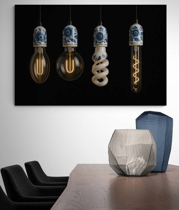 Een moderne interpretatie van klassiek Delfts blauw: elegante fittingen met bloemmotieven die verschillende soorten gloeilampen dragen. Van ronde en langwerpige lampen tot een spiraalvormig ontwerp – elke lamp krijgt een artistieke uitstraling door de verfijnde porseleinen details. Een kunstwerk dat innovatie en traditie samenbrengt in een stijlvol design.