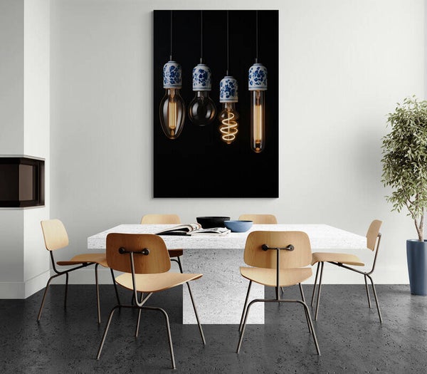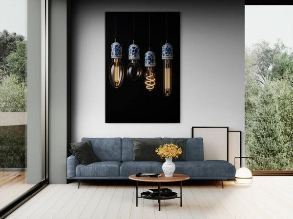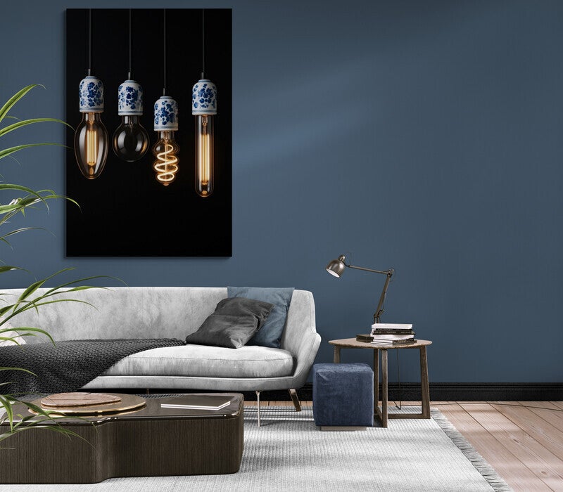 Een bijzonder Delfts blauw schilderij waarin traditionele bloemmotieven samenkomen met moderne gloeilampen. De warme gloed van het licht contrasteert prachtig met het helderblauwe porselein.