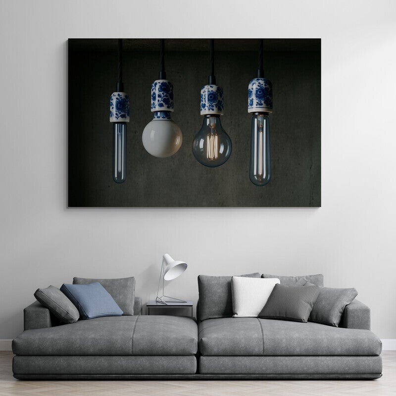 Een krachtig en karaktervol kunstwerk waarin industriële lampen samenkomen met de tijdloze schoonheid van Delfts blauw. Het ruwe beton op de achtergrond versterkt het stoere karakter, terwijl de verfijnde blauw-witte patronen de lampen een elegante en ambachtelijke uitstraling geven. Een schilderij dat industriële charme en klassieke kunststijl harmonieus combineert.