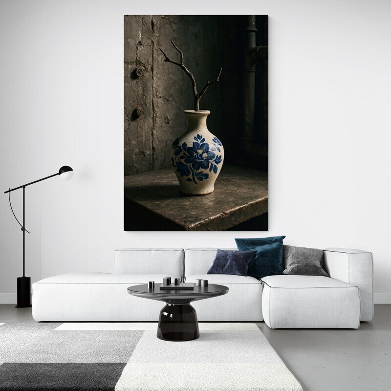 Een krachtig kunstwerk waarin de schoonheid van eenvoud en stilte centraal staat. De Delfts blauwe vaas met zijn bloemmotief contrasteert met de ruwe, verweerde betonstructuur van de achtergrond. De kale tak versterkt de sobere, industriële uitstraling en geeft het werk een tijdloze en bijna meditatieve sfeer. Perfect voor liefhebbers van industriële interieurs met een verfijnd kunstzinnig accent.