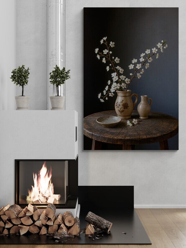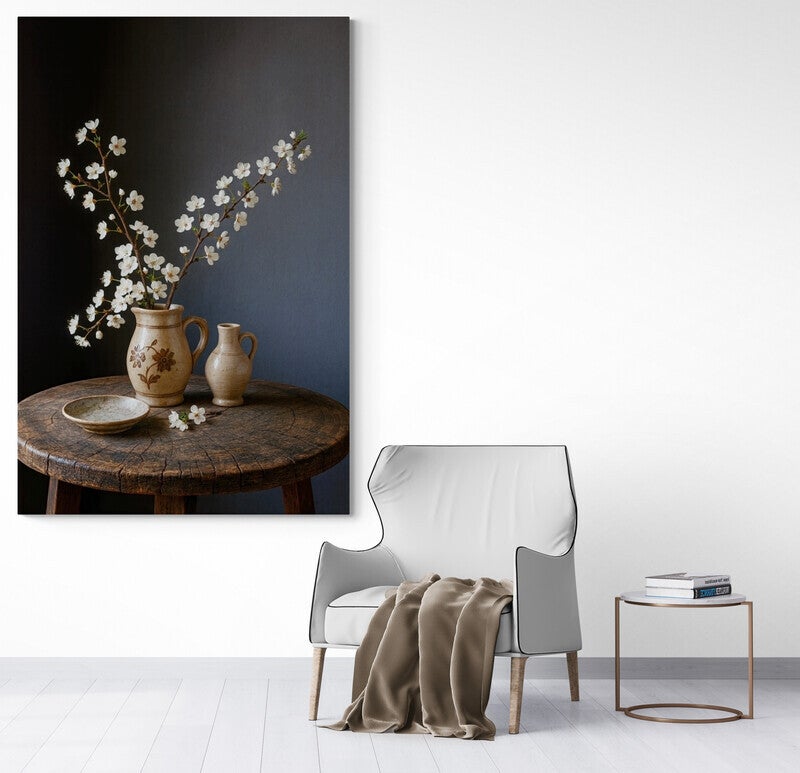 Een warm en verstild schilderij waarin een bloesemtak sierlijk uit een rustieke aardewerken vaas omhoog rijst. Naast de vaas staan een klein kruikje en een ondiep schaaltje, geplaatst op een robuuste houten tafel. Het zachte licht en de matte muur op de achtergrond geven dit kunstwerk een serene en landelijke uitstraling, ideaal voor een interieur met natuurlijke accenten.