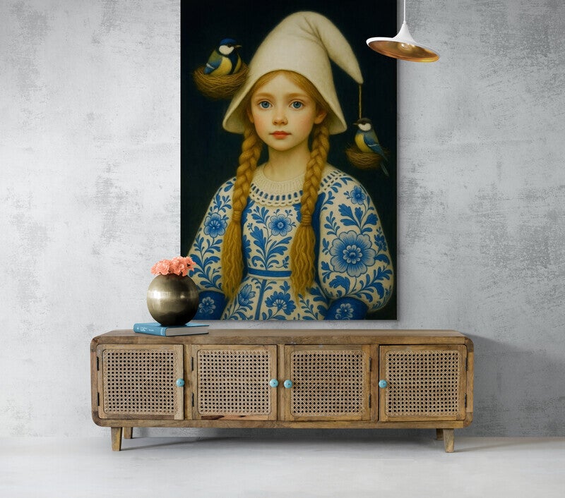 Dit exclusieve schilderij ademt de sfeer van de oude meesters, met een jong meisje in traditionele kledij en diepblauwe bloemmotieven in Delfts blauw. Twee koolmezen rusten in hun nesten aan haar hoed, een symbool voor geborgenheid en harmonie met de natuur. Het werk combineert klassieke verfijning met een vleugje symboliek, perfect voor een interieur met karakter.