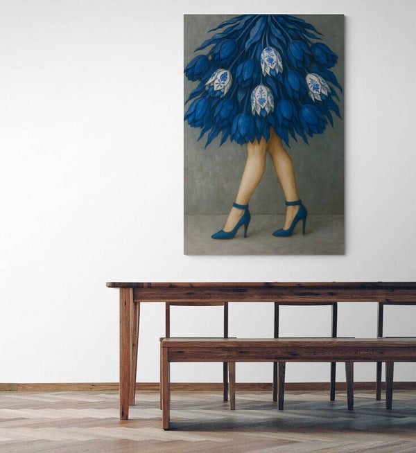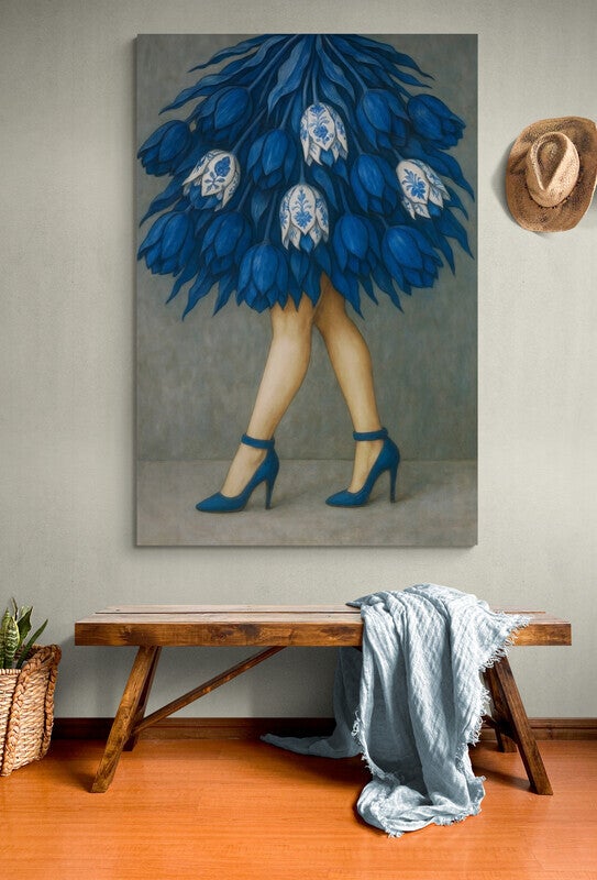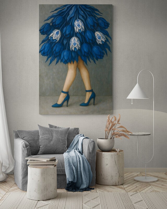 Een uniek kunstwerk waarin mode en traditie samensmelten: een jurk opgebouwd uit diepe blauwe tulpen, waarvan enkele bloembladeren porseleinen Delfts blauw patronen tonen. De elegante benen en hakken benadrukken de couture-uitstraling, terwijl de fijne schilderstijl dit werk een klassieke, bijna museale kwaliteit geeft. Perfect voor liefhebbers van kunst met een exclusieve twist.