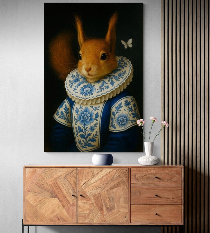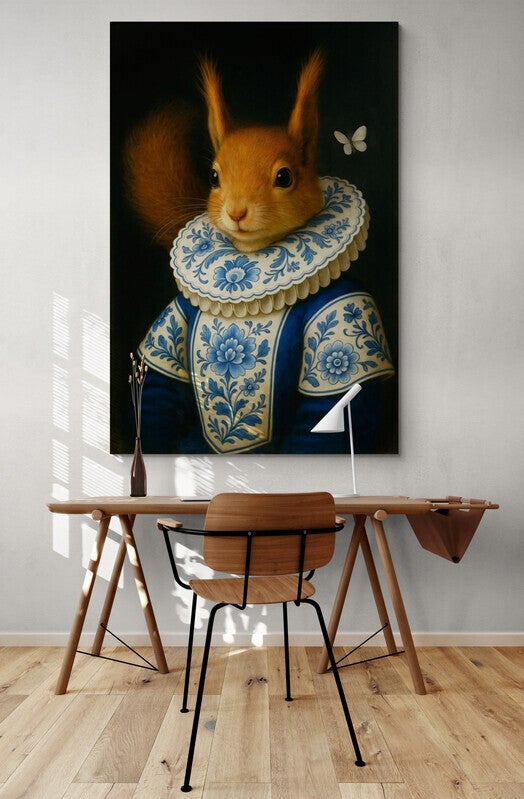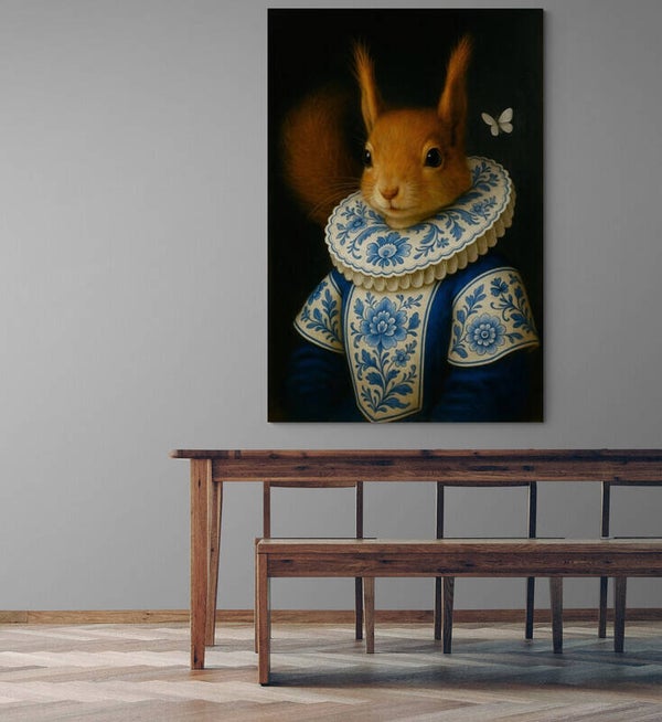 Een exclusief schilderij waarin een sierlijke eekhoorn wordt afgebeeld alsof hij een aristocratisch portret uit de 17e eeuw is. De eekhoorn draagt een rijk gedecoreerde kraag en kostuum in Delfts blauw bloemmotief. De donkere achtergrond en het subtiele vlindertje versterken de sfeer van oude meesters en geven dit kunstwerk een tijdloze, museale uitstraling.