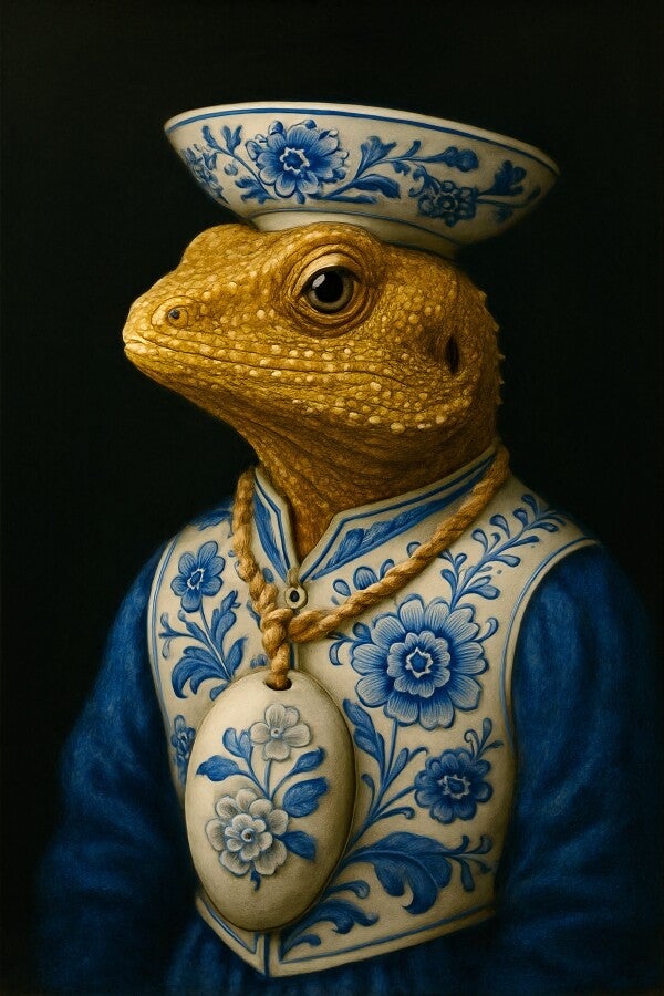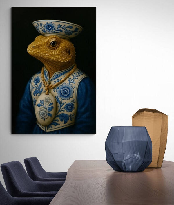 Een exclusief schilderij van een gouden hagedis, weergegeven als een aristocratisch portret in de stijl van de oude meesters. De hagedis draagt een rijk gedecoreerd Delfts blauw kostuum met bloemmotief en een porseleinen schaal als hoofdtooi. Het donkere decor versterkt de museale uitstraling en maakt dit werk tot een uniek, bijna surrealistisch kunstwerk dat de kijker direct in de sfeer van een klassiek museum trekt.