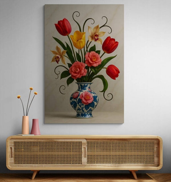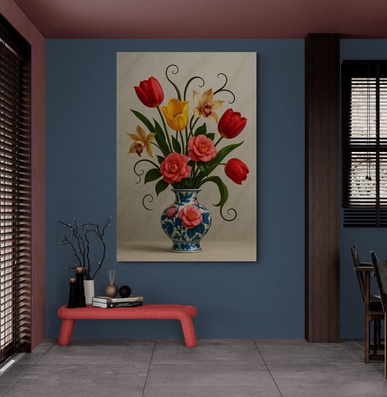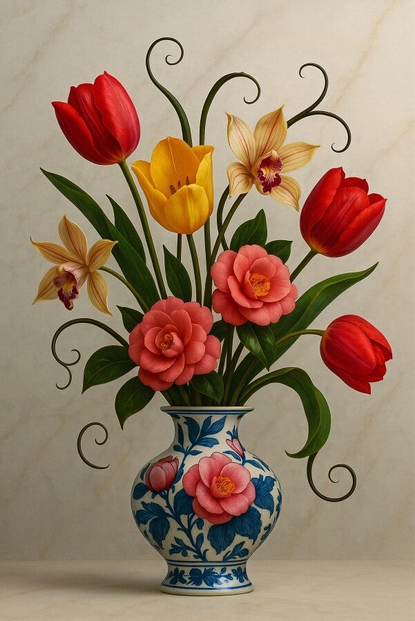 Dit schilderij toont een rijk bloemstuk van tulpen, camelia’s en orchideeën in een verfijnde Delfts blauwe vaas. De marmerachtige achtergrond geeft het geheel een luxueuze uitstraling, alsof het een klassiek stilleven is uit een museumcollectie. Een werk dat elegantie en verfijning combineert met frisse kleuren.