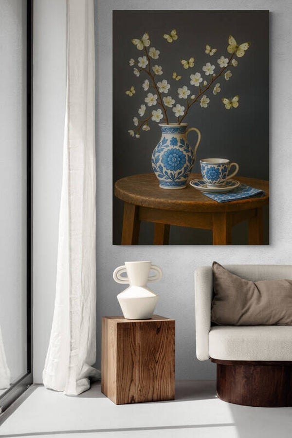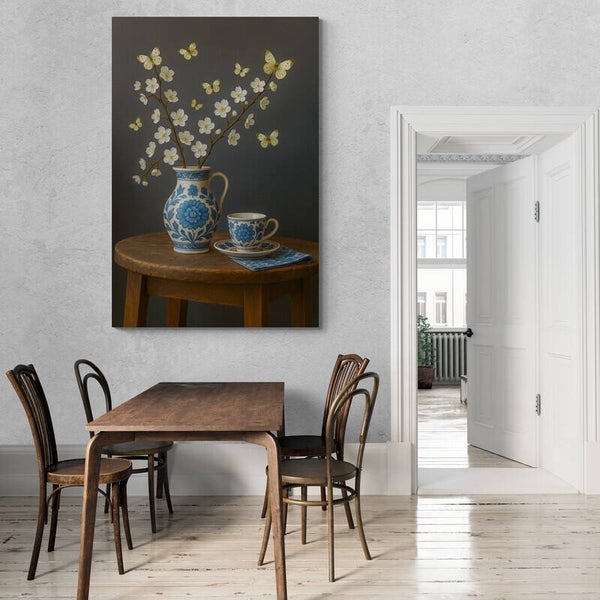 Een betoverend stilleven waarin bloesemtakken in een Delfts blauwe kan schitteren, omringd door sierlijke vlinders. Het bijpassende kopje en schoteltje op een houten tafel versterken de huiselijke en landelijke sfeer. Een werk dat lente, lichtheid en nostalgie samenbrengt in één harmonieus geheel.