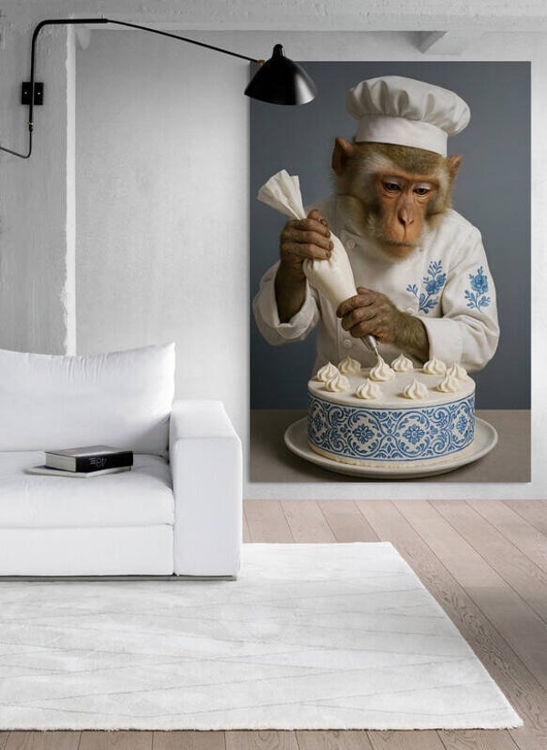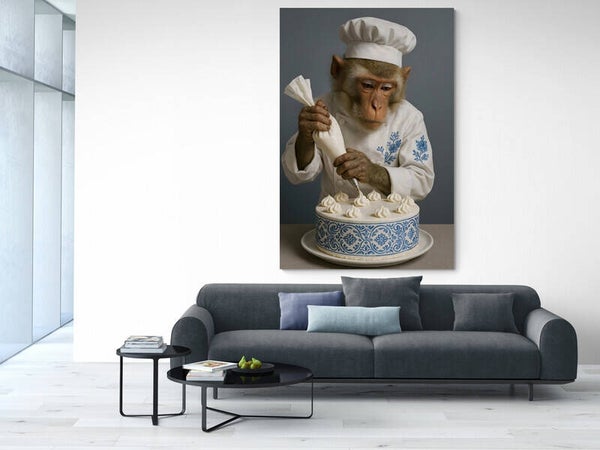 Een speels en origineel kunstwerk waarin een aap als taartenbakker te zien is. Gekleed in een wit koksjasje met Delfts blauwe bloemen en een koksmuts, decoreert hij een prachtige roomtaart met Delfts blauw motief. Dit schilderij combineert humor, vakmanschap en de herkenbare Hollandse stijl van Delfts blauw. Een echte blikvanger voor in de keuken, eetkamer of moderne woonkamer.