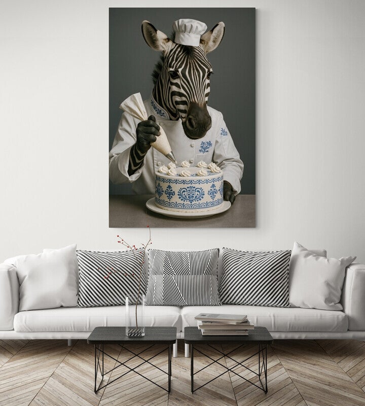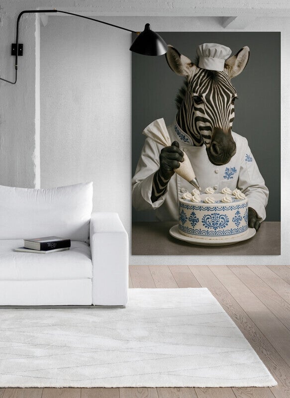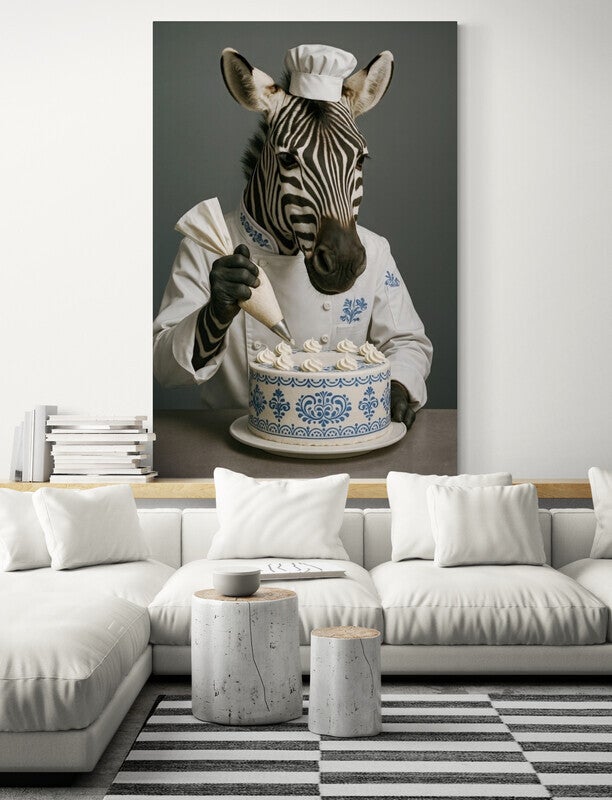 Een opvallend en speels schilderij waarin een zebra de rol van taartenbakker vertolkt. Met een wit koksjasje, gedecoreerd met Delfts blauwe bloemmotieven, brengt hij met uiterste precisie room aan op een prachtig versierde taart met klassiek blauw patroon. Een humoristisch kunstwerk dat uitstekend past in de keuken, eetkamer of als vrolijk accent in een moderne woonruimte.