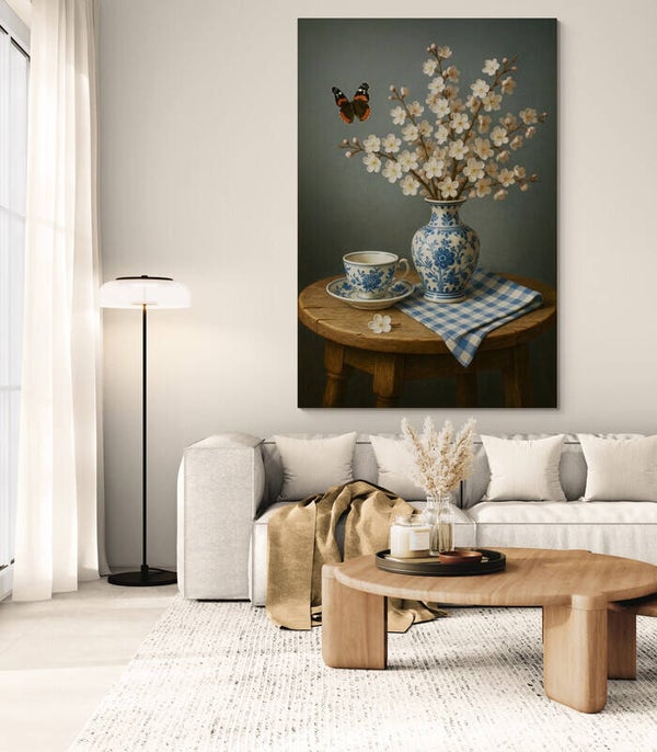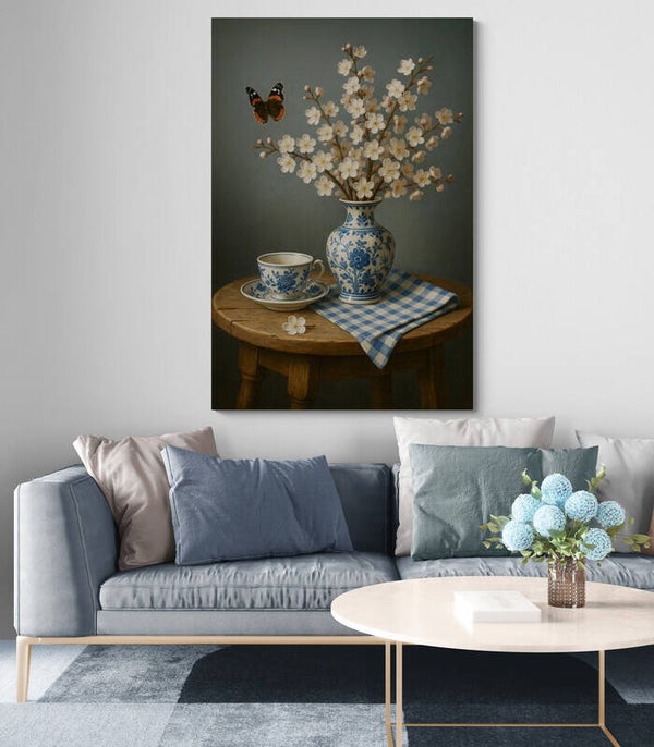 Een tijdloos schilderij van een Delfts blauwe vaas gevuld met witte bloesemtakken. Naast de vaas staat een verfijnd Delfts blauw theekopje met schotel, geplaatst op een houten kruk met een blauw geruit doekje. Een vlinder zweeft elegant langs de bloesem en voegt een levendig detail toe. Dit kunstwerk ademt landelijke sfeer en klassieke verfijning, perfect voor ieder interieur dat warmte en rust zoekt.