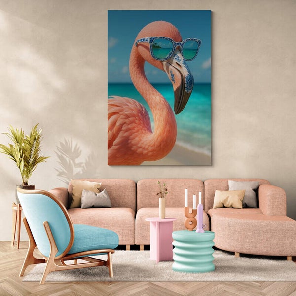 Een kleurrijk schilderij van een elegante flamingo aan zee, met een Delfts blauwe zonnebril en sierlijke blauwe details op de snavel. Dit kunstwerk combineert tropische zomersfeer met de klassieke charme van Delfts blauw. Een vrolijke blikvanger die warmte en humor toevoegt aan elk interieur.