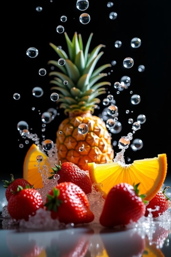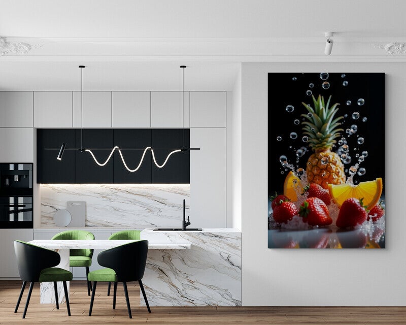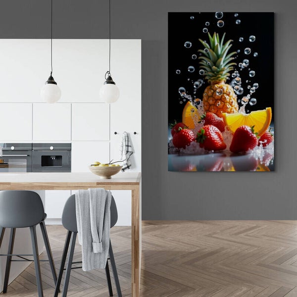 Een levendig en hyperrealistisch kunstwerk waarin een ananas, sappige aardbeien en frisse sinaasappelpartjes samenkomen in een explosie van water en luchtbelletjes. Het frisse effect en de heldere kleuren maken dit schilderij een echte blikvanger in de keuken, eetkamer of een moderne horecazaak.