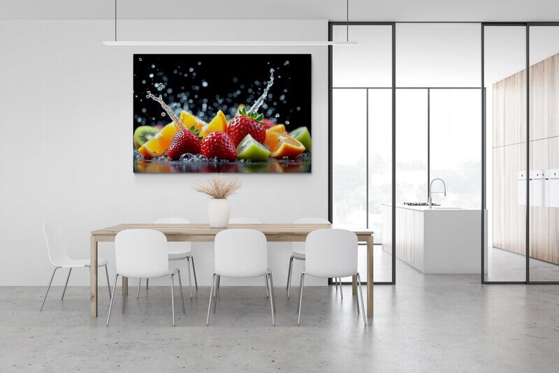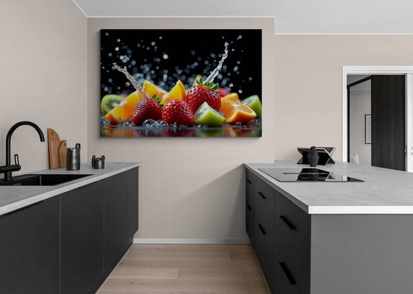 Een krachtig en levendig schilderij waarin aardbeien, kiwi en sinaasappelpartjes samenkomen in een frisse waterexplosie. De dynamiek van spattend water geeft het kunstwerk een energieke en moderne uitstraling. Perfect als blikvanger in de keuken of eetruimte.