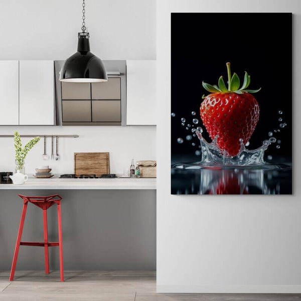 Een hyperrealistisch schilderij van een sappige rode aardbei die in het water valt en een dynamische splash veroorzaakt. De levendige kleuren en het contrast met de donkere achtergrond maken dit kunstwerk een moderne en frisse toevoeging aan elke keuken of eetruimte.