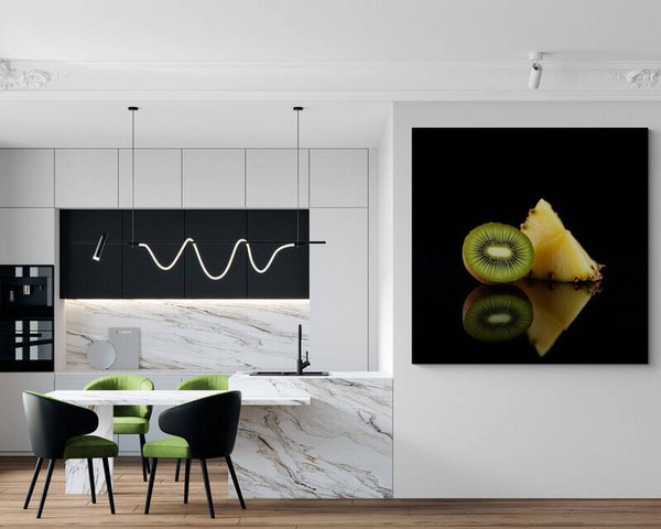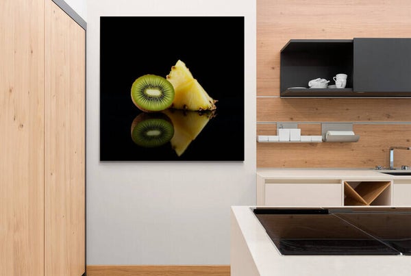 Een hyperrealistisch schilderij van een doorgesneden kiwi en frisse ananaspartjes, stijlvol weergegeven tegen een zwarte achtergrond met subtiele spiegeling. De contrasterende kleuren groen en geel zorgen voor een frisse en moderne uitstraling. Een perfect kunstwerk voor keuken of eetkamer dat direct een luxueuze sfeer toevoegt.