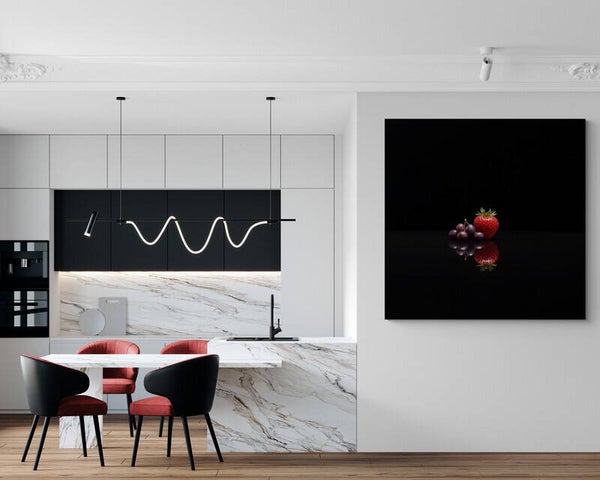 Een hyperrealistisch kunstwerk van een rijpe aardbei en trosje druiven, subtiel weergegeven met spiegeling op een diepzwarte achtergrond. De eenvoud en het contrast geven dit schilderij een moderne, luxe uitstraling. Perfect als keuken schilderij of wanddecoratie voor een eigentijds interieur.