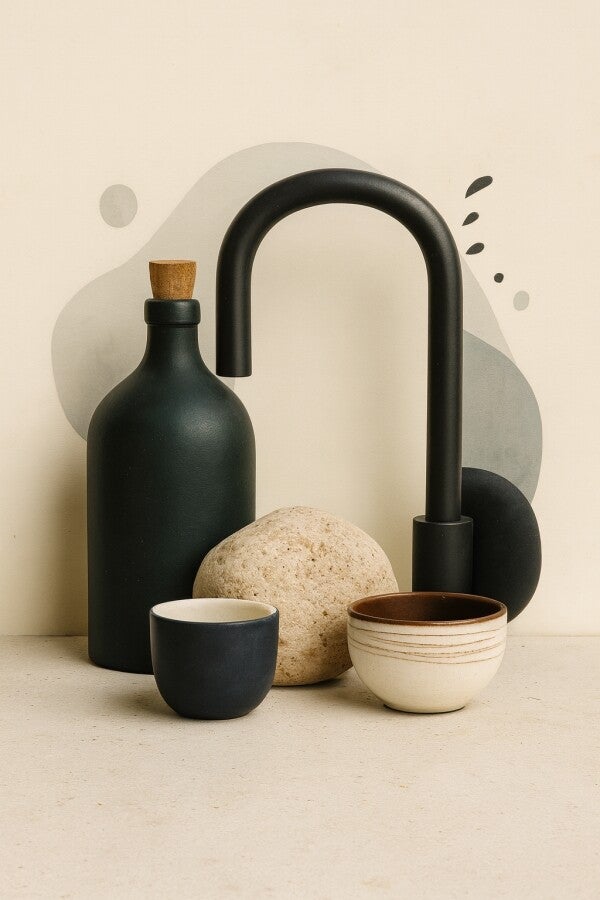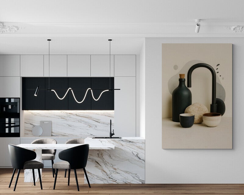 Een kalme, minimalistische compositie waarin matte keramiek, natuursteen en zachte grafische vormen samensmelten. Dit kunstwerk brengt een serene rust in de keuken of eetruimte — perfect voor liefhebbers van Scandinavisch design en natuurlijke tinten. De zachte beige achtergrond en zwarte accenten creëren harmonie en balans, ideaal voor moderne, stijlvolle interieurs.