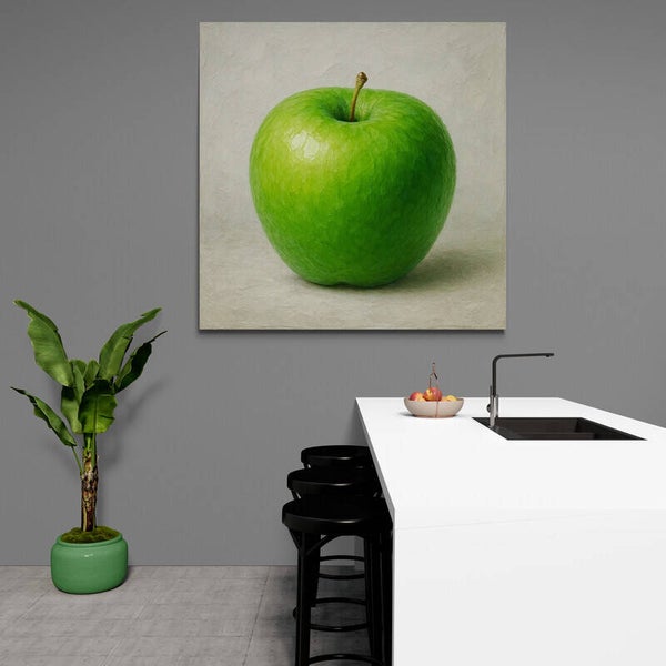 Een frisgroene appel in volle eenvoud. Dit schilderij straalt zuiverheid, balans en vitaliteit uit — precies de energie die je in een moderne keuken wilt voelen. De subtiele penseelstructuur en zachte lichtval geven het geheel een verfijnde, bijna tastbare uitstraling. Een kunstwerk dat rust brengt, maar tegelijk een levendig accent toevoegt aan elke keukenwand.