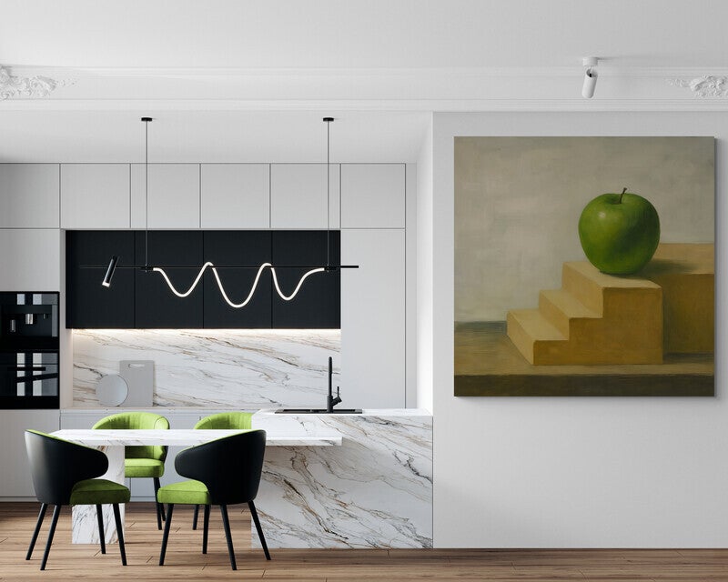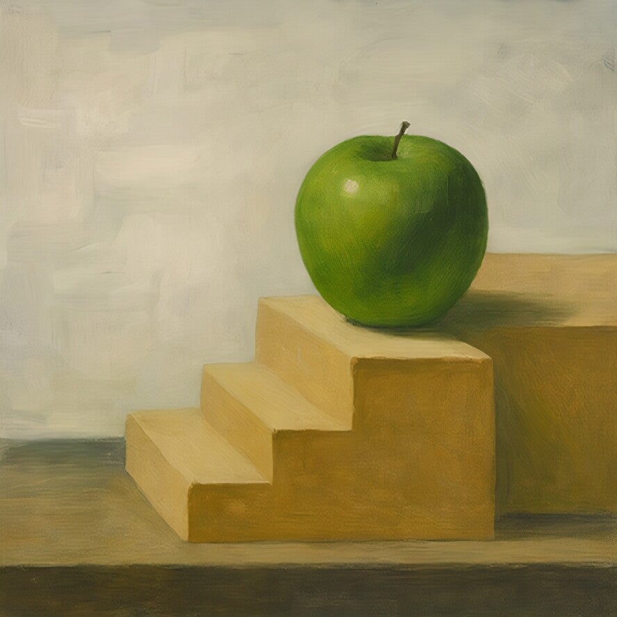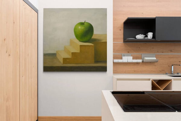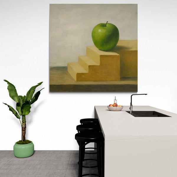 Een minimalistisch en verfijnd schilderij waarin een groene appel rust op geometrische traptreden. De zachte penseelstreken en subtiele lichtval creëren een rustige, bijna poëtische sfeer. Dit kunstwerk brengt balans tussen realisme en abstractie en vormt een eigentijdse blikvanger in moderne keukens en eetruimtes.