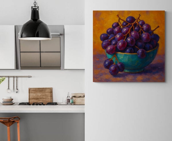 Een levendig keuken schilderij met een tros blauwe druiven in een turquoise schaal tegen een warme, goudgele achtergrond. De penseelstreken zijn expressief en vol diepte, waardoor het fruit bijna tastbaar lijkt. Dit kleurrijke werk brengt energie en vitaliteit in je keuken en straalt pure ambacht en liefde voor eten uit.