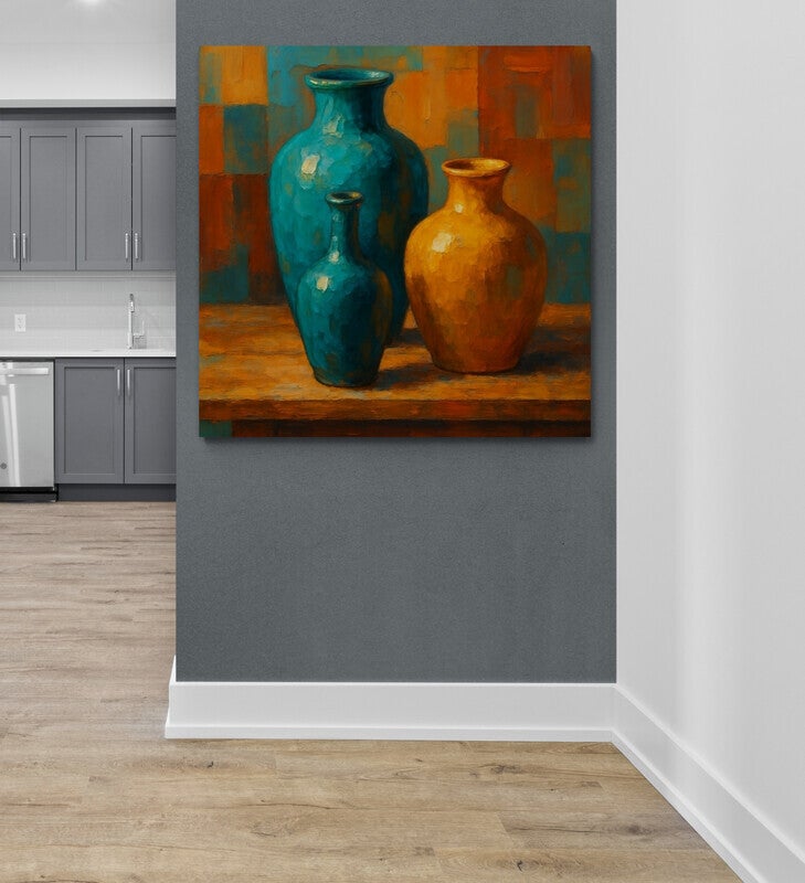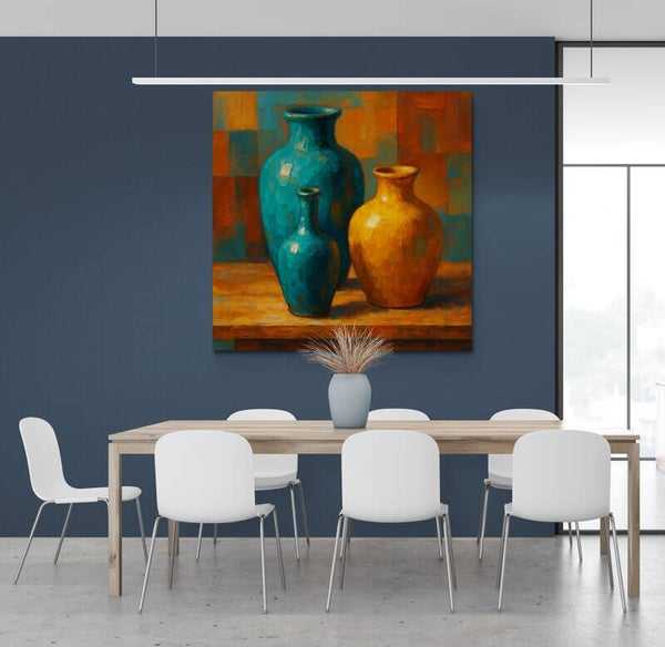 Een eigentijds kunstwerk dat warmte en balans in de keuken brengt. Drie abstract geschilderde vazen in turquoise en okergeel staan op een houten tafel, met een achtergrond van warme tinten in mozaïekpatroon. De penseelstreken zijn zichtbaar en geven het schilderij een levendige structuur, ideaal voor een keuken waar kleur en stijl samenkomen.