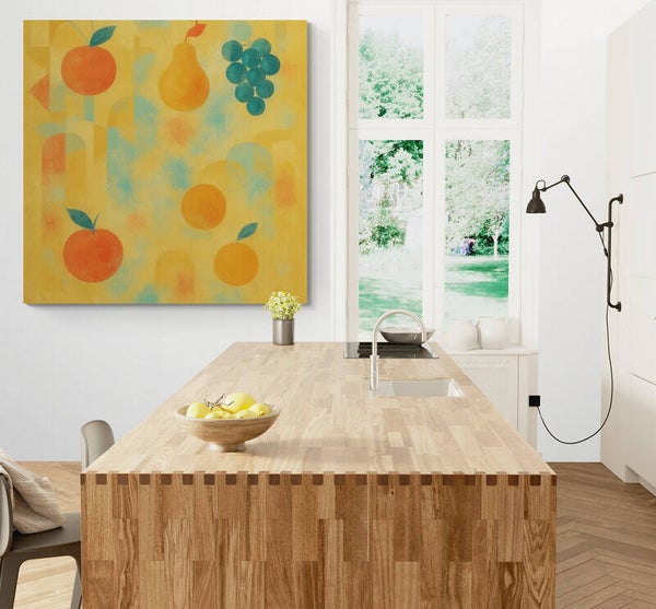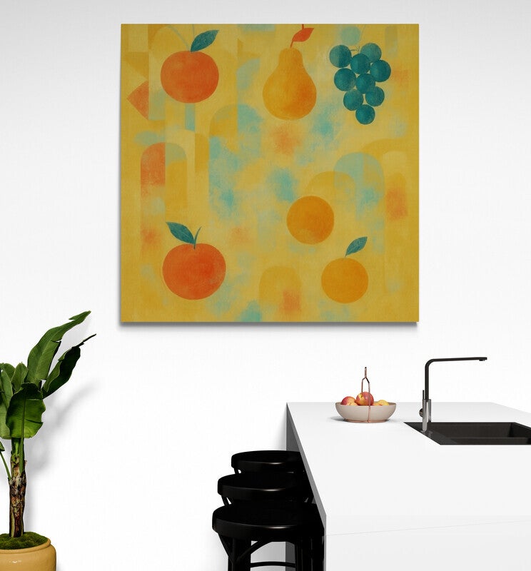 Een modern en luchtig schilderij vol zomerse frisheid. Op een warme gele achtergrond zijn sinaasappels, een peer en druiven te zien, abstract weergegeven in zachte vormen en transparante lagen. Dit kunstwerk brengt een subtiele knipoog naar fruit en genieten aan de keukenwand – stijlvol en minimalistisch tegelijk.