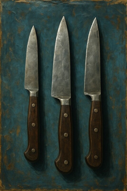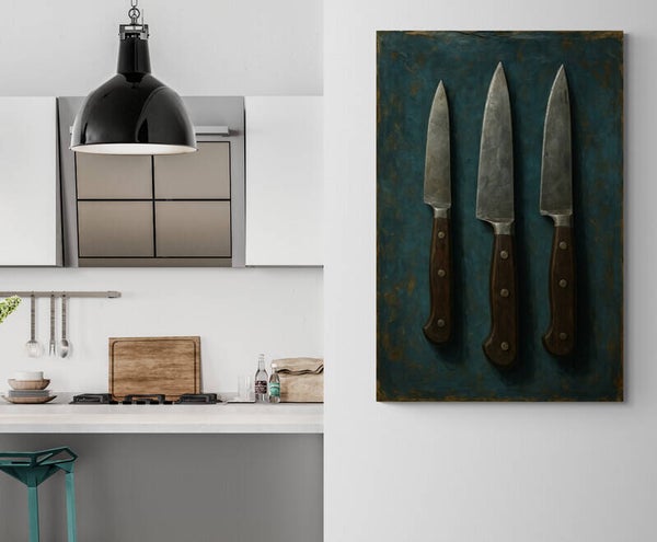 Een krachtig en sfeervol abstract schilderij met drie messen op een blauwgroene achtergrond. De combinatie van staal en hout, samen met de levendige penseelstructuur, geeft dit werk een stoere, ambachtelijke uitstraling. Perfect voor keukens waarin koken, stijl en vakmanschap samenkomen.