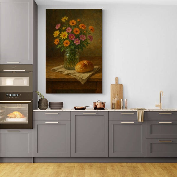 Een warm en rustgevend schilderij dat de charme van een landelijke keuken vangt. Een vaas met veldbloemen in zachte kleuren staat op een houten tafel naast een vers brood, badend in warm licht. Dit keuken schilderij brengt een gevoel van eenvoud, huiselijkheid en natuurlijke schoonheid in elke ruimte.