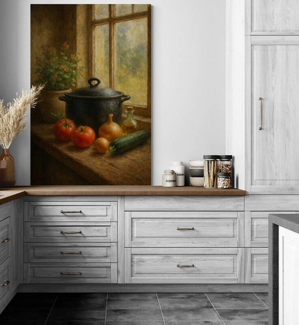 Een sfeervol schilderij dat de warmte en rust van een landelijke keuken vastlegt. Op de houten vensterbank staan een gietijzeren pan, verse groenten en een flesje olijfolie in het zachte licht van de ochtendzon. De schilderachtige details en warme kleuren brengen een huiselijke, authentieke sfeer in de keuken.