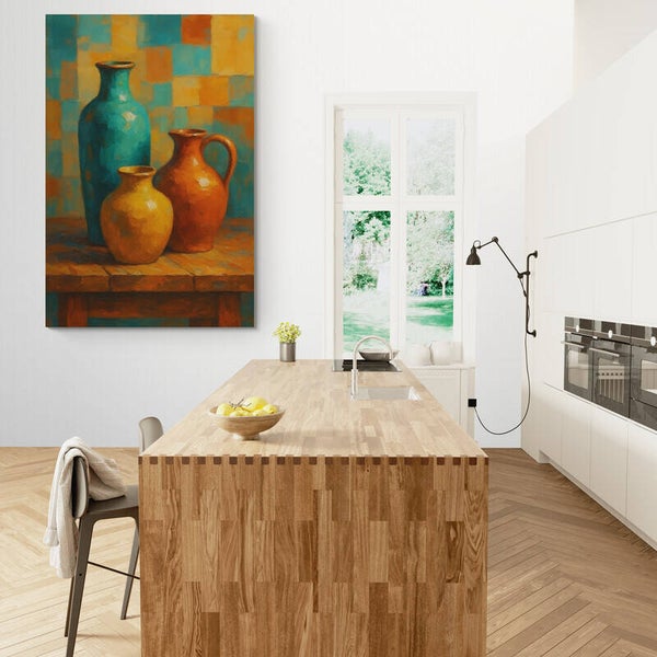 Een sfeervol en evenwichtig abstracte keuken schilderij dat warmte en elegantie uitstraalt. Ceramic Elegance toont drie keramische vazen in turquoise, oranje en okergeel, geplaatst op een houten tafel met een mozaïekachtige achtergrond. De zachte penseelstreken en rijke kleuren brengen een mediterrane rust in elke keuken of eetkamer. Perfect voor wie houdt van artistieke eenvoud met een vleugje vintage.
