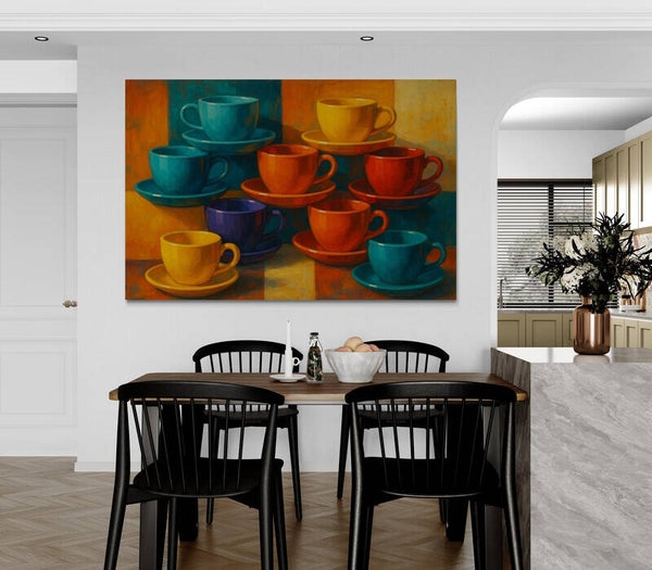 Dit keuken schilderij met abstracte koffiekopjes brengt kleur, warmte en karakter in je interieur. De speelse compositie van felgekleurde kopjes tegen een geometrische achtergrond creëert een levendig tafereel dat perfect past in moderne en landelijke keukens. De rijke penseelstreken en contrasterende tinten zorgen voor een warme, uitnodigende sfeer — ideaal boven de eettafel of koffiehoek.