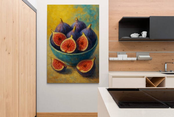 Dit keuken schilderij met verse vijgen straalt warmte en elegantie uit. De rijke paarse tinten van de vijgen contrasteren prachtig met de turquoise schaal en de goudgele achtergrond. Het kunstwerk brengt een mediterrane sfeer in je keuken of eetkamer en past perfect bij landelijke, bohemien of moderne interieurs. De penseelstreken geven diepte en textuur, waardoor het schilderij een zachte, uitnodigende uitstraling heeft.