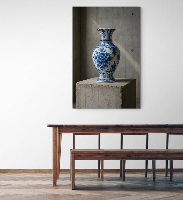 Een Delfts blauw schilderij met een klassieke porseleinen vaas in bloemmotief, geplaatst op een betonnen sokkel. De industriële achtergrond versterkt het contrast tussen verfijnd handwerk en ruwe structuur. Het licht valt subtiel over het oppervlak, waardoor de vaas centraal en helder naar voren komt.