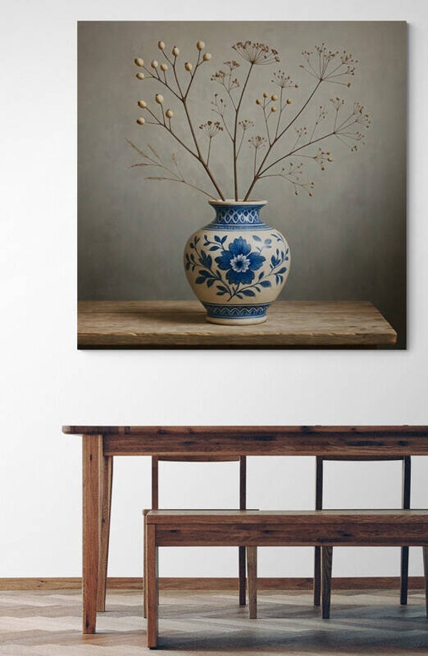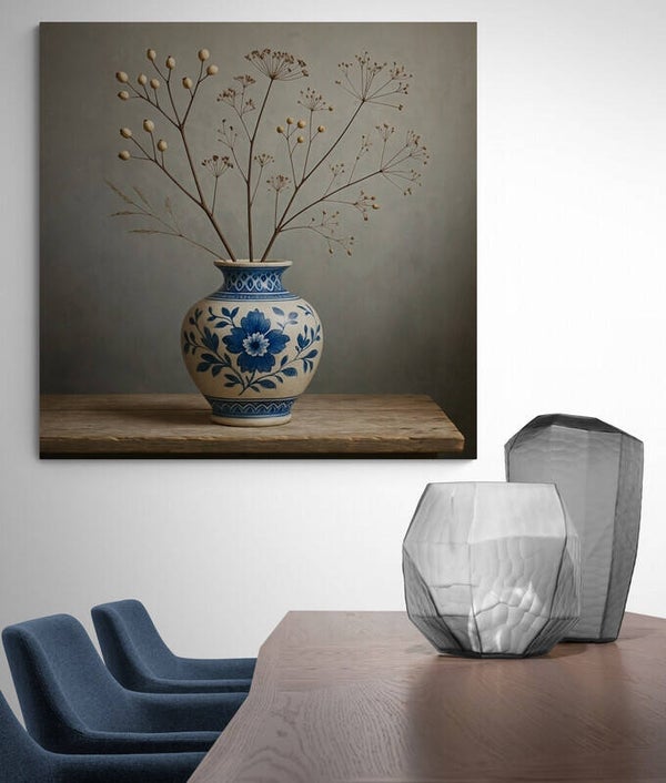 Een Delfts blauw schilderij met een aardetint-vaas voorzien van blauw bloemmotief. De vaas staat op een houten tafel en is gevuld met dunne takken met zaaddozen, die zorgen voor een natuurlijke, luchtige compositie. De zachte achtergrond en de eenvoudige vormgeving geven het werk een rustige en landelijke uitstraling.