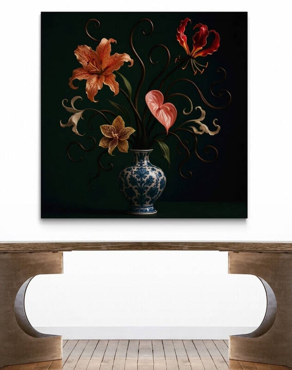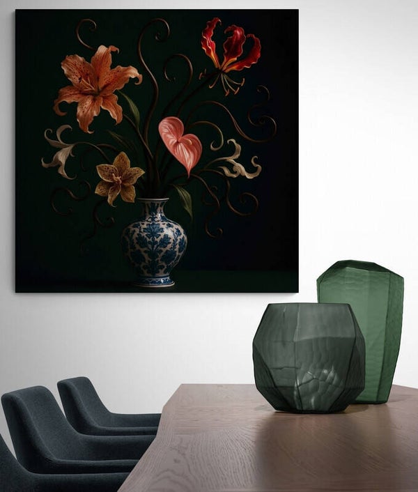Een modern Delfts blauw schilderij waarin een klassieke vaas is gevuld met exotische bloemen in warme tinten rood, oranje en zachtgeel. De diepe donkergroene achtergrond versterkt de dramatische uitstraling van het geheel. Het samenspel tussen traditionele motieven en eigentijdse bloemvormen maakt dit werk perfect voor interieurs die karakter en stijl willen combineren.