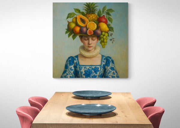 Een sfeervol schilderij van een vrouw in Delfts blauw kostuum met een uitbundige fruitkroon. De compositie straalt rust en overvloed uit: de zachte gezichtsuitdrukking contrasteert prachtig met de levendige kleuren van sinaasappels, vijgen, druiven en ananas. Het werk brengt een moderne twist aan het klassieke portret en past perfect in een interieur dat karakter en warmte wil uitstralen.