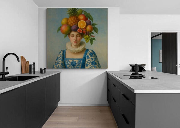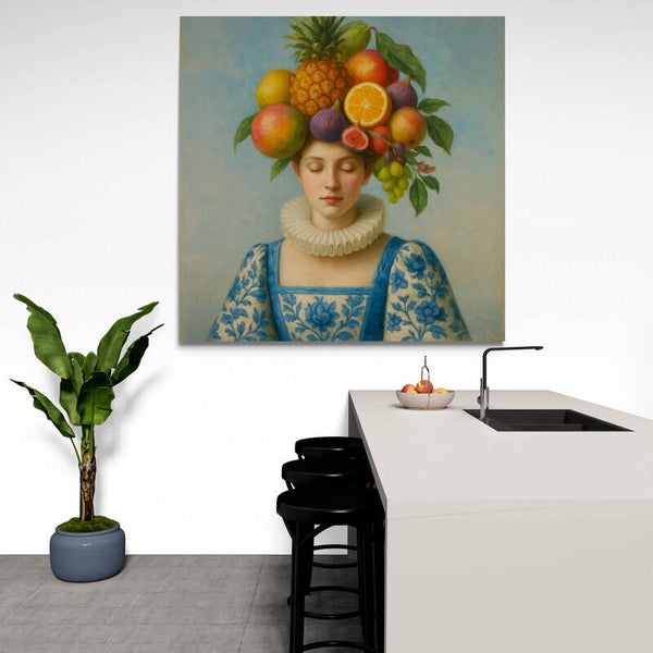 Een dromerig schilderij van een vrouw in een Delfts blauw kleed, met een kroon van zomers fruit in zachte, warme kleuren. De lichte achtergrond en kalme uitdrukking geven het werk een vredige, bijna tijdloze uitstraling. De combinatie van klassieke details en levendige kleuren maakt dit schilderij een echte blikvanger in elk interieur, van modern tot landelijk.