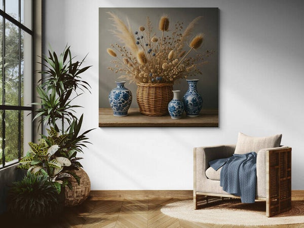 Een warm en sfeervol schilderij waarin drie Delfts blauwe vazen harmonieus staan naast een gevlochten mand vol droogbloemen. De zachte tinten beige, stro en blauw brengen een rustgevende balans in beeld. Dit stilleven ademt landelijke elegantie en past prachtig in een interieur met natuurlijke materialen zoals hout, linnen of riet.