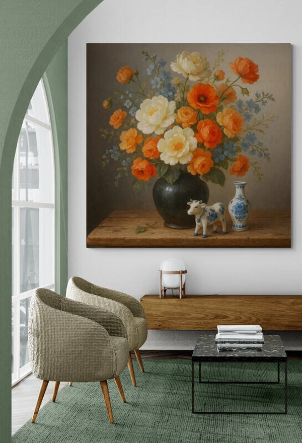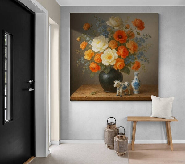 Een warm en elegant Delfts blauw schilderij met een klassiek bloemstuk in zachte penseelstijl. De combinatie van witte en oranje bloemen, aangevuld met subtiele blauwe bloesems, zorgt voor een harmonieuze en verfijnde uitstraling. Op tafel staan een Delfts blauw vaasje en een klein koeienbeeldje die een nostalgisch accent geven aan dit zachte stilleven. Perfect voor landelijke of klassieke interieurs die warmte en karakter uitstralen.