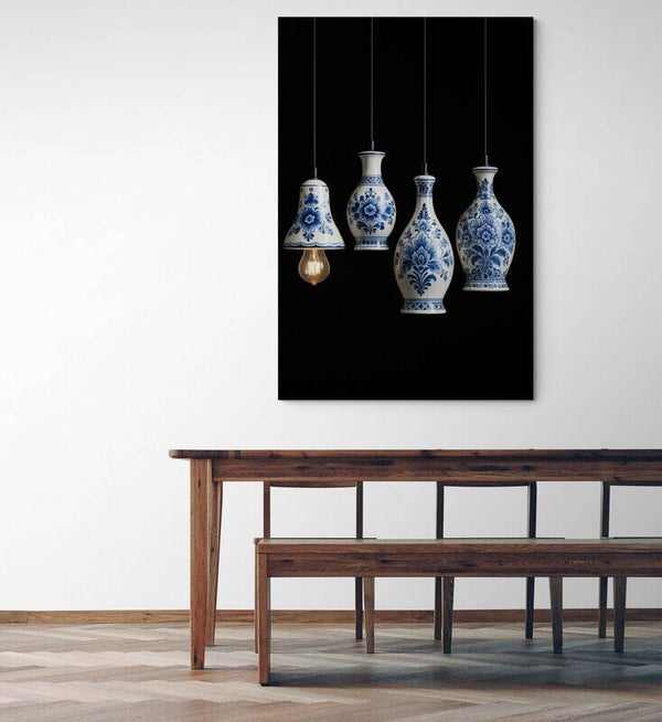 Dit moderne Delfts blauw schilderij laat stijlvolle hanglampen zien die zijn gevormd als klassieke porseleinen vazen met handgeschilderde bloemmotieven. De elegante blauwe decoraties komen prachtig naar voren tegen de diepe zwarte achtergrond. Deze unieke combinatie van traditioneel Delfts blauw en strak design zorgt voor een krachtig, stijlvol en eigentijds kunstwerk dat past in moderne interieurs, designkeukens en stijlvolle horecagelegenheden.