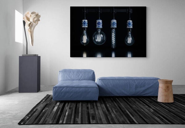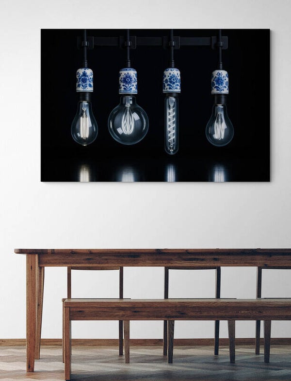 Een modern Delfts blauw schilderij met een unieke combinatie van industriële lampen en klassiek porselein. De porseleinen fittingen met handgeschilderde Delfts blauwe bloemmotieven geven een warm Hollands accent aan het strakke ontwerp. De zwarte achtergrond versterkt de luxe, moderne uitstraling. Perfect voor wie houdt van design met karakter — van moderne keukens tot trendy woonkamers en stijlvolle horecazaken.