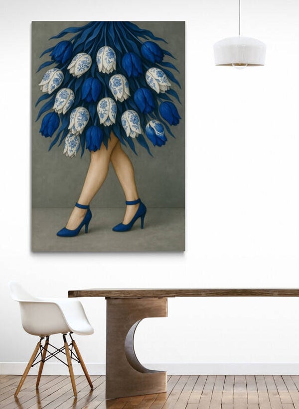 Een uniek en elegant schilderij waarin traditionele Delfts blauwe motieven samenkomen met een moderne, stijlvolle vorm: een dansende jurk van tulpen. De zachte grijze achtergrond benadrukt de rijke blauwtinten, terwijl de subtiele canvasstructuur zorgt voor een authentieke schilderachtige uitstraling. Een bijzonder kunstwerk dat elegantie en Hollandse symboliek perfect combineert.