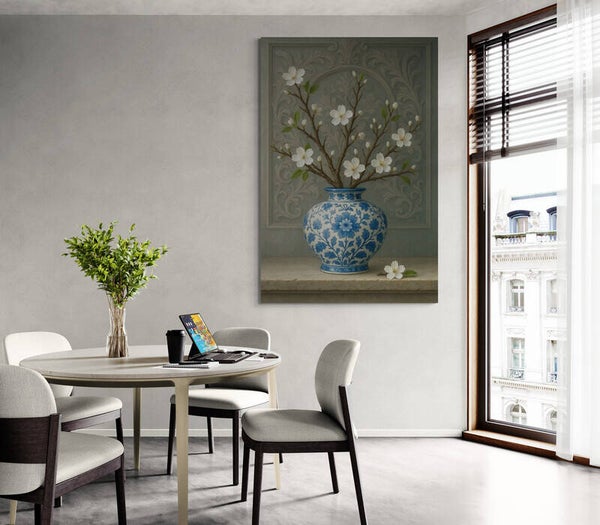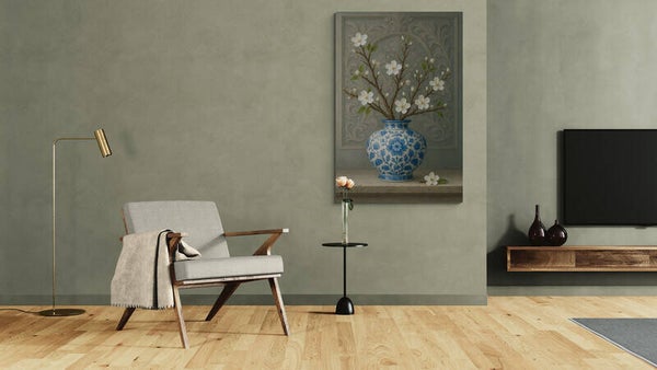 Een stijlvol kunstwerk waarin de tijdloze elegantie van Delfts blauw centraal staat. De klassieke vaas met verfijnde bloemenmotieven vormt een prachtig contrast met de zachte achtergrond en de lichte bloesemtakken. De subtiele kleuren en sierlijke compositie zorgen voor een rustgevende, elegante sfeer. Perfect als blikvanger in een landelijke of moderne woonruimte.
