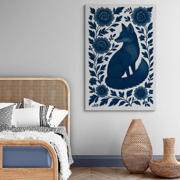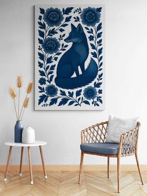 Een uniek kunstwerk waarin een sierlijke vos centraal staat, omringd door klassieke Delfts blauwe bloemmotieven. De elegante lijnen en rijke blauwe tinten brengen een moderne ode aan het traditionele Hollandse design. Deze illustratie combineert tijdloze elegantie met een speels accent, perfect voor liefhebbers van landelijke, romantische of moderne interieurs.