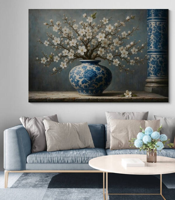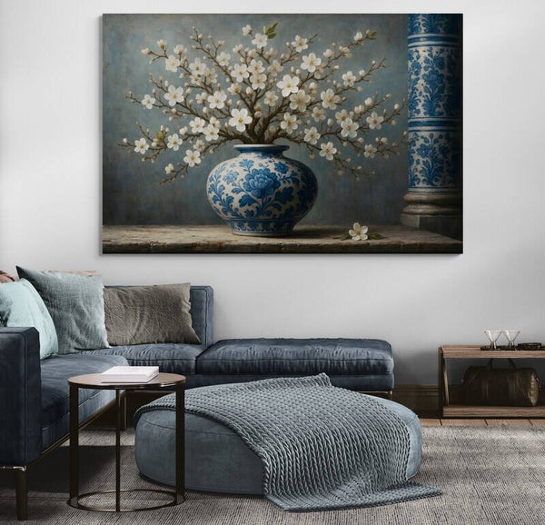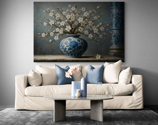 Een verfijnd kunstwerk waarin delicate bloesemtakken stijlvol uit een traditionele Delfts blauwe vaas groeien. De zachte tinten en klassieke motieven zorgen voor een landelijke en serene sfeer in huis. Perfect voor wie houdt van tijdloze elegantie, rust en natuurlijke schoonheid.