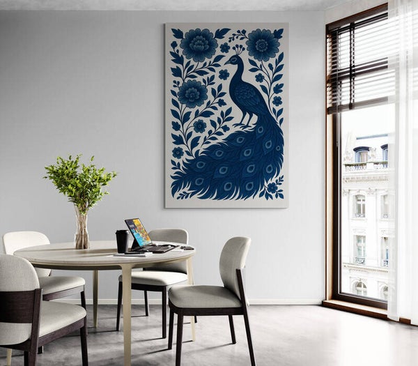 Een sierlijke pauw omringd door rijk gedetailleerde bloemen, uitgevoerd in klassieke Delfts blauwe tinten. Dit tijdloze ontwerp straalt elegantie en verfijning uit en is geïnspireerd op traditionele Hollandse keramiek. De zachte lijnen en diepe blauwtinten maken dit kunstwerk een prachtige blikvanger in elk interieur.