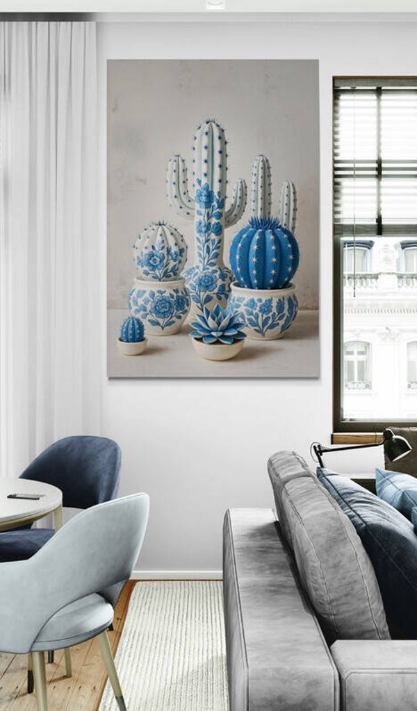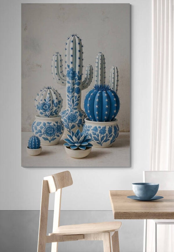 Een verfijnd kunstwerk waarin traditionele Delfts blauwe patronen samenkomen met moderne cactusvormen. De combinatie van klassieke bloemmotieven en strakke vormen creëert een uniek contrast dat tijdloos én eigentijds aanvoelt.