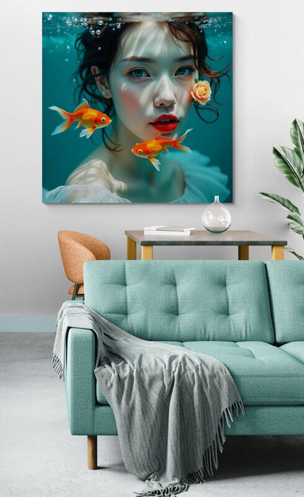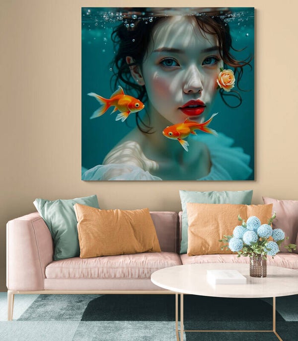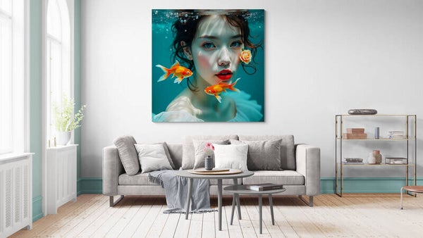 Een surrealistisch portret van een vrouw onder water, omringd door goudvissen en een bloem in haar haar. De lichte waterbelletjes en het zachte zonlicht creëren een elegante en serene uitstraling. Dit schilderij past perfect in moderne en stijlvolle interieurs en vormt een subtiele blikvanger aan de muur.