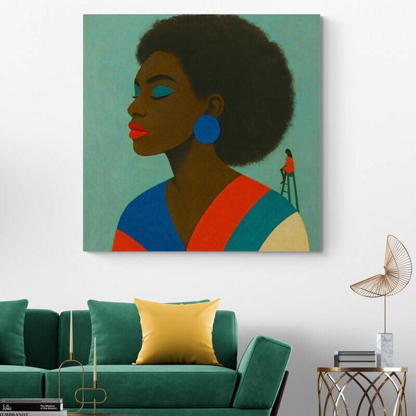 Een abstract en krachtig portret van een vrouw met verfstructuur en subtiele papiertextuur. De heldere kleuren en minimalistische vormen creëren een modern kunstwerk met karakter. De combinatie van blauwe, rode en natuurlijke tinten maakt dit schilderij opvallend en tijdloos. Perfect als blikvanger in een modern, industrieel of artistiek interieur.